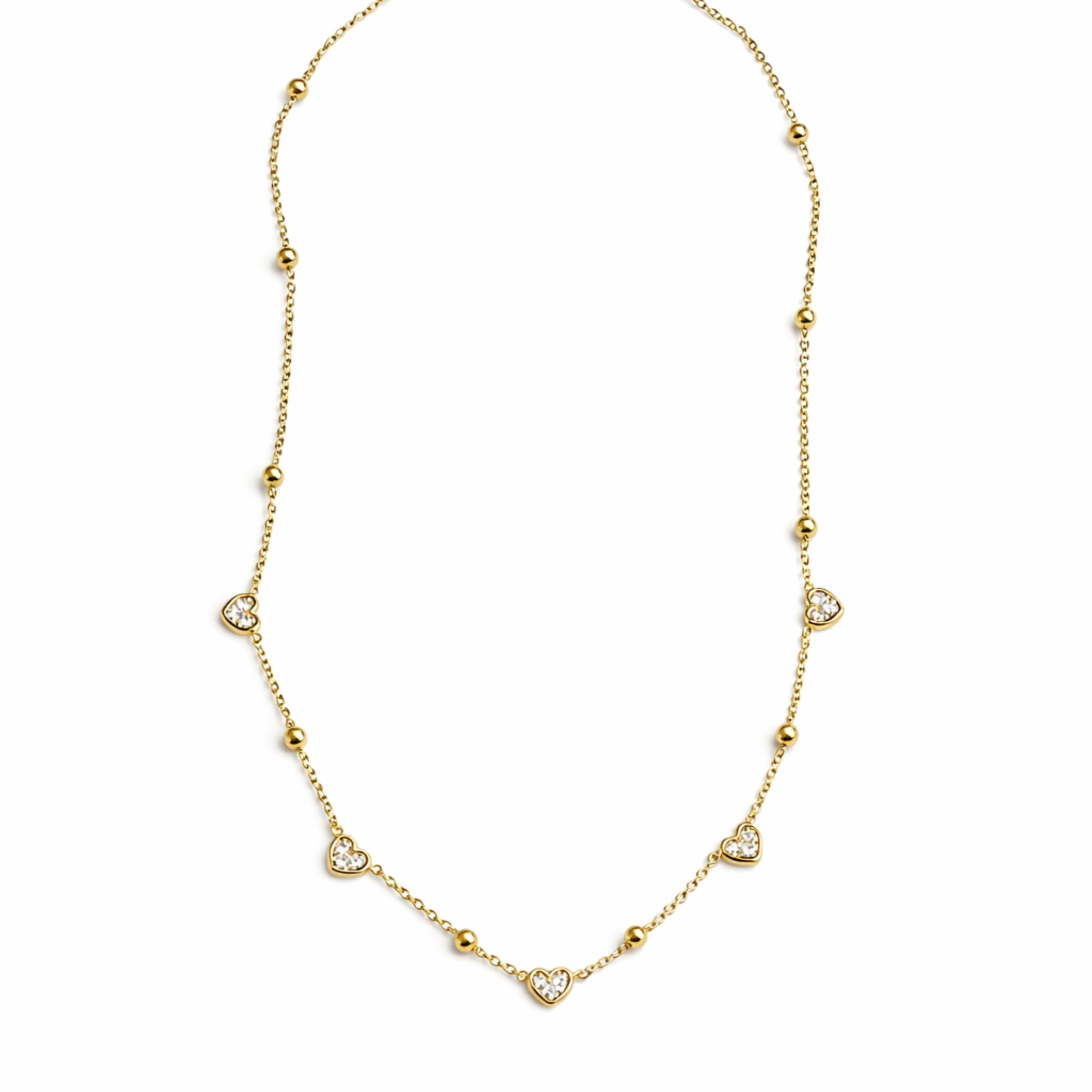 Cada corazón está adornado con una piedra brillante tipo circonia cúbica, aportando destellos suaves que iluminan tu look. La cadena es chapada en oro 18 de 18k que incluye pequeñas cuentas doradas que añaden textura y un acabado más sofisticado.