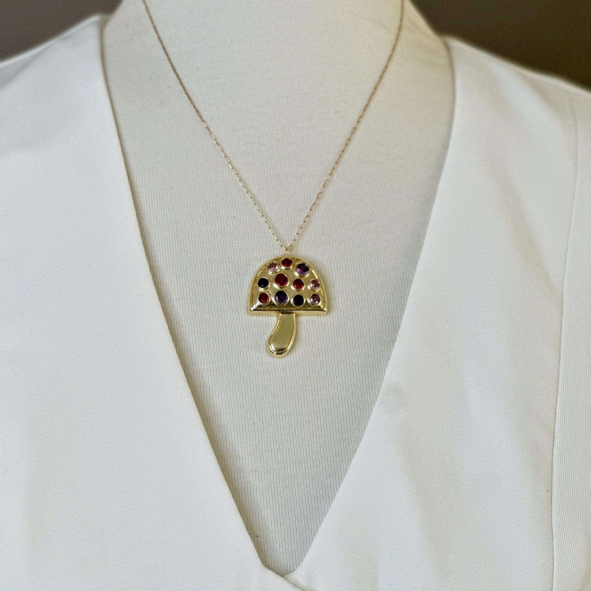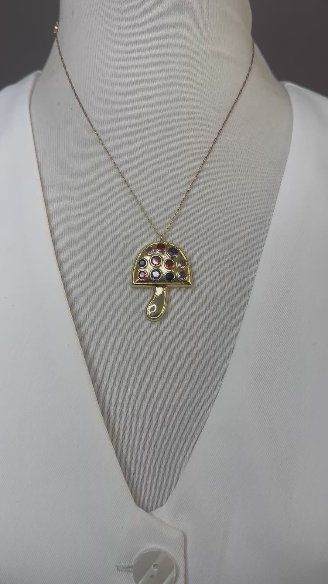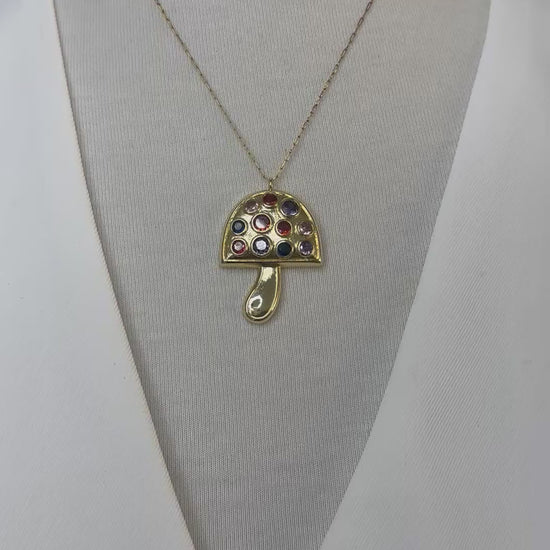Un delicado collar con dije en forma de hongo, elaborado en tono dorado y decorado con piedras en tonos rojos y azul que evocan la magia de la naturaleza. Una pieza original y divertida que aporta un toque único a tu estilo. 🍄💎