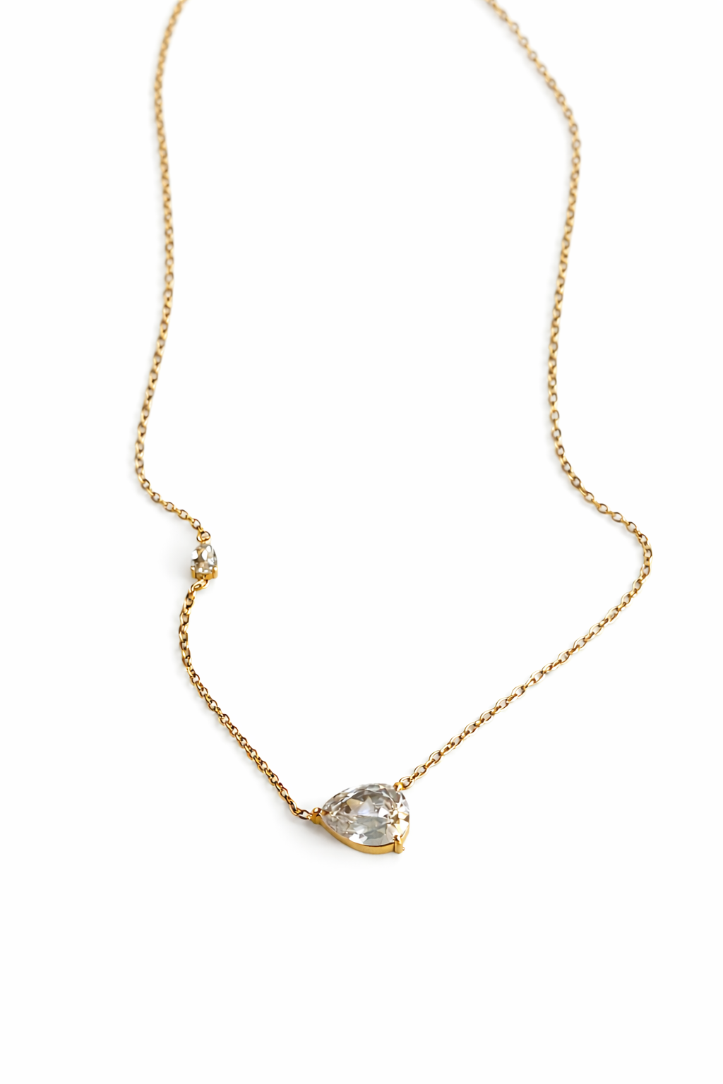 Collar de diseño delicado y minimalista con zirconia transparente de corte elegante, montada en acero inoxidable con acabado dorado. Su cadena fina y ligera lo convierte en una pieza versátil, ideal para el uso diario o para ocasiones especiales.